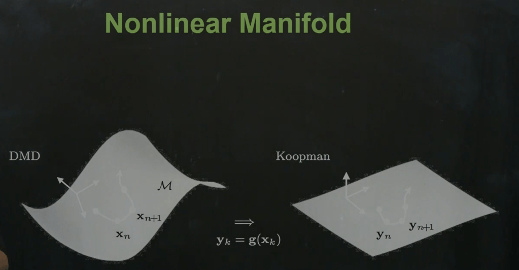Let’s see how it is applied in solving PDEs and relationship between DMD (dynamic mode decomposition) and Koopman operator. DMD and Koopman operators relationship can be illustrated by below diagram by Nathan Kutz: