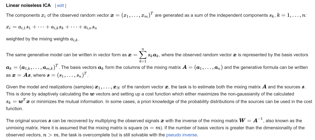 The math of ICA can be illustrated using a simple noiseless and linear signal combination in wikipedia: