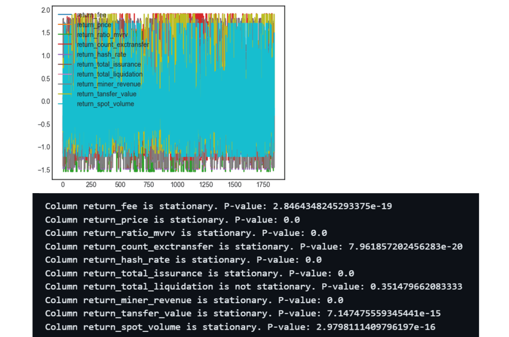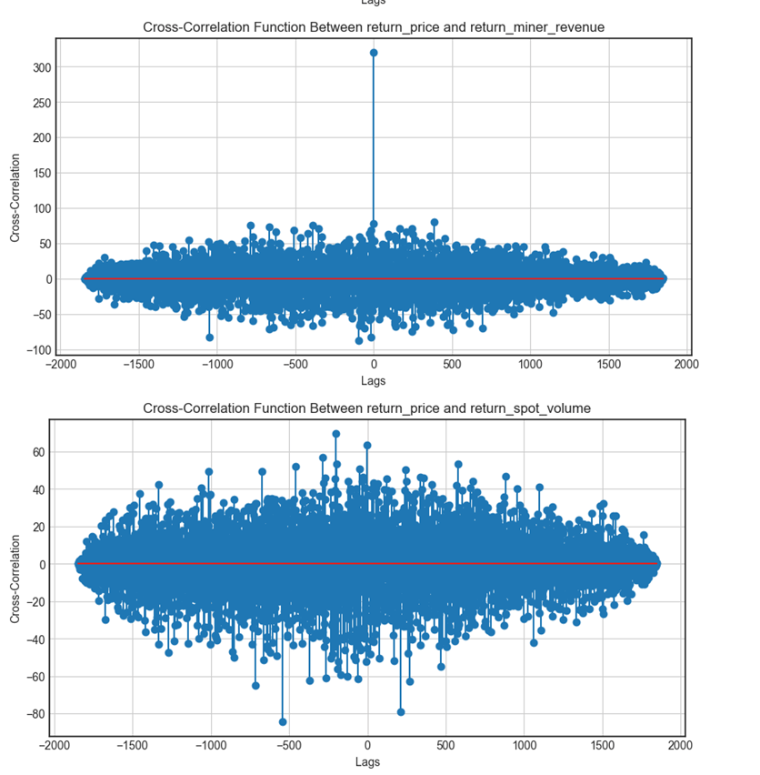 Cross Correlation Function (CCF) to verify and identify if there are data points highly correlated in lead-lag fashion. Consistent with correlation matrix above, mvrv has high correlation with price return in a lag fashion, so is miner revenue and price return, but not as strong, while spot volume doesn’t have such effect with price return.