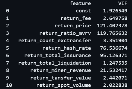 Hence from below output, it verifies that ratio of MVRV, Hash Rate, Total Issurance and Miner Revenue is highly correlated with other variables