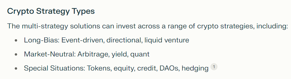 - Invests in established crypto hedge funds running various strategies like event-driven, arbitrage, quant, etc.
