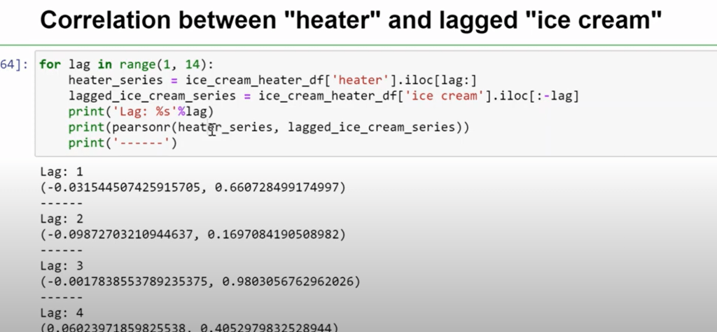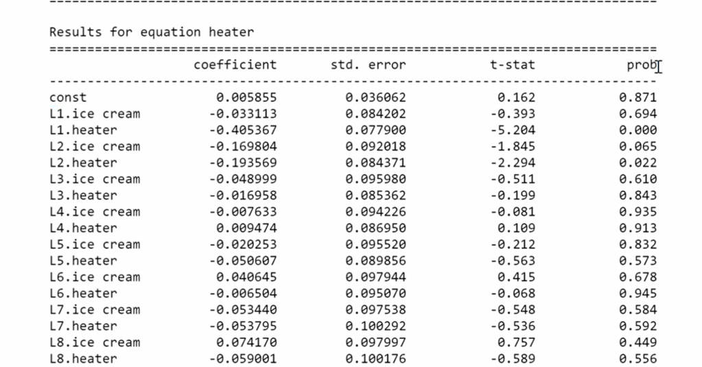 in doing VAR, only tricky part is to figure out parameters for the cross referenced time series, in his demo, he used correlation between heater and lagged ice cream of 13 lags experimentally.