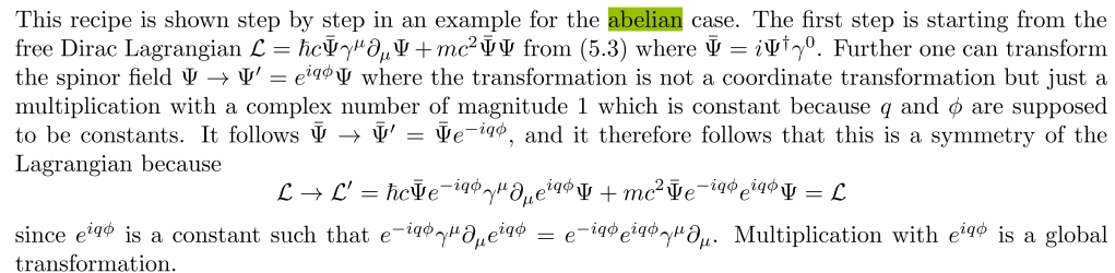 The recipe for a gauge theory has been applied to an abelian symmetry. Later it will be extended to