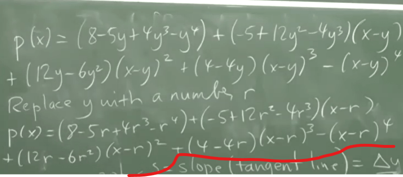 replacing y with r, a trick done to parameterize the curve, and his approach turns out magically same as Tayler’s expansion. It greatly helps mathematicians to understand the function value at r, or the zeroth approximation at r, then the tangent line to P at r, the tangent conic to P at r, and tangent cubic to P at r.