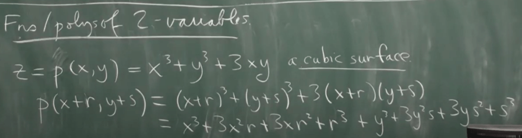 Then it’s natural to think about polynomials with two variables. so let’s look at folium P(x, y) = x^3 + y^3 + 3xy again, a good example of cubic surfaces, not cubic lines. We approach it with Lagrange’s again: