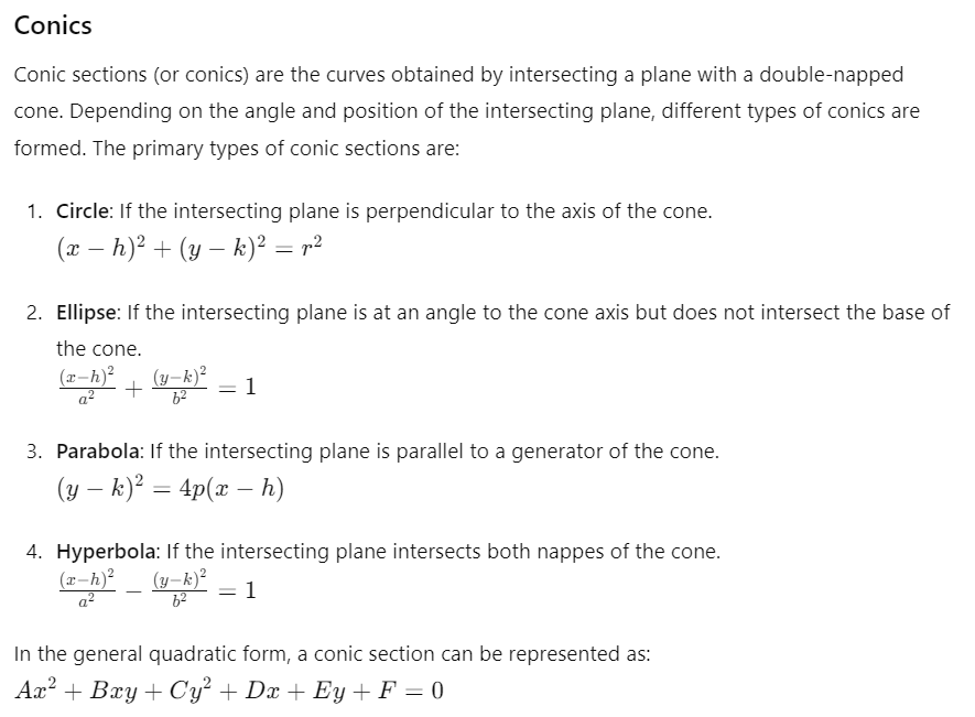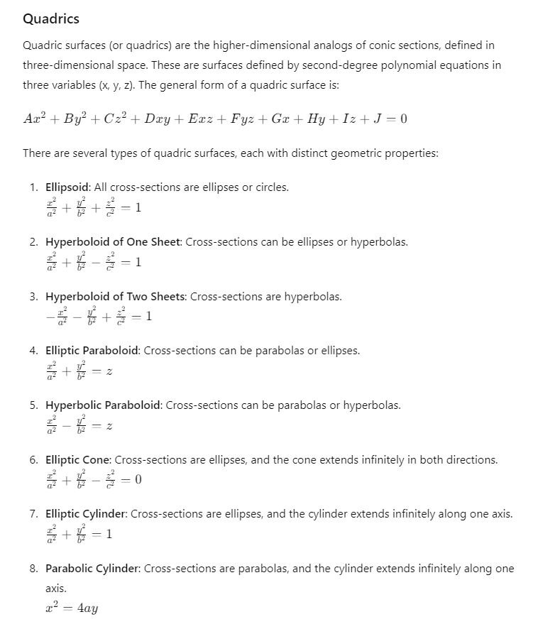 Conics are curves formed by intersecting a plane with a double-napped cone in two dimensions. Examples include circles, ellipses, parabolas, and hyperbolas.Quadrics are surfaces formed by second-degree polynomial equations in three dimensions. Examples include ellipsoids, hyperboloids, paraboloids, cones, and cylinders.