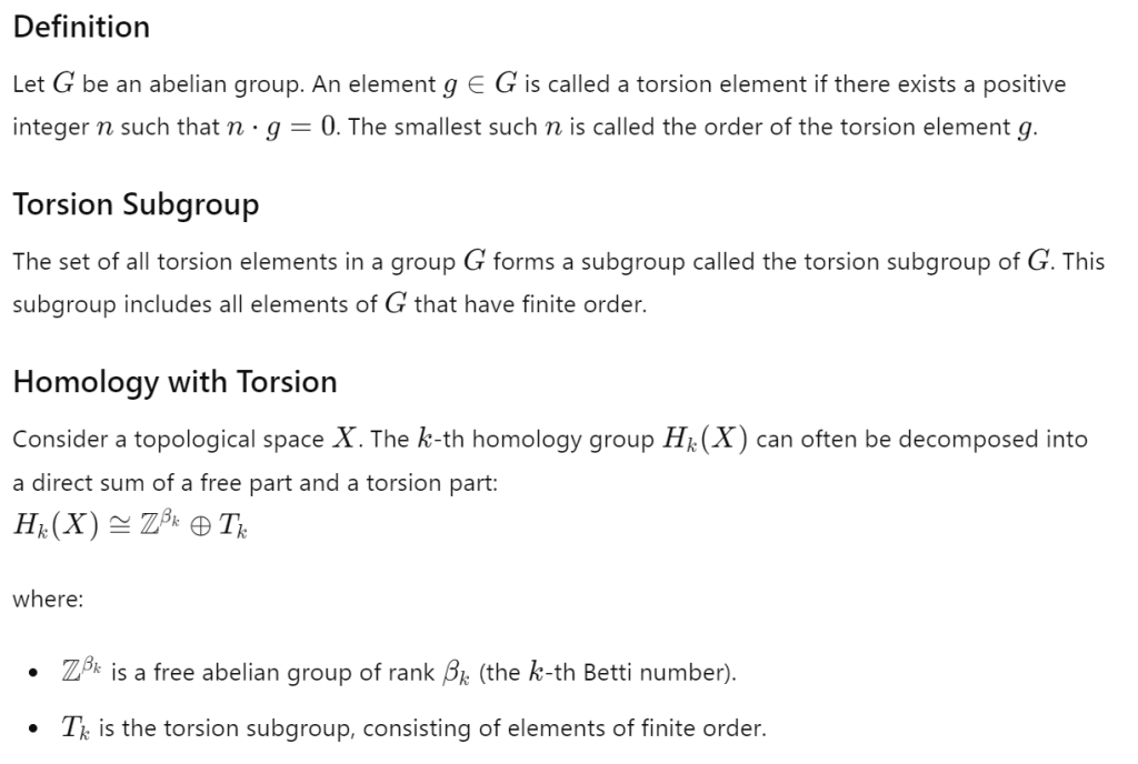 Given a topological space, its homology groups can contain elements of infinite order (free part) and elements of finite order (torsion part). The presence of torsion elements indicates certain structural or topological properties of the space.