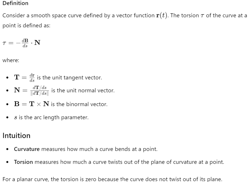 In differential geometry, torsion is associated with the twisting of a space curve. Specifically, it measures how a curve deviates from being planar.