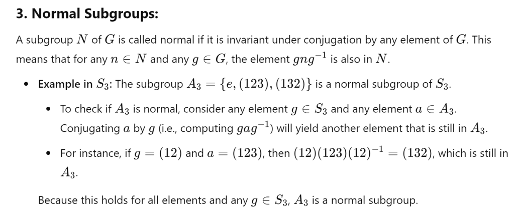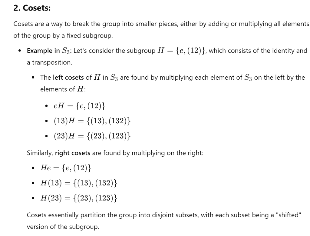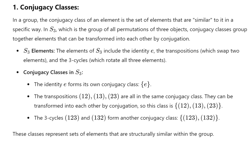 Additional notes on conjugacy classes (not groups) and cosets and normal subgroup, using S3 as example to explain: Conjugacy classes group elements that are similar in the structure.Cosets are the group split into parts based on a subgroup.A normal subgroup is a special subgroup where the structure is preserved even when elements are conjugated.