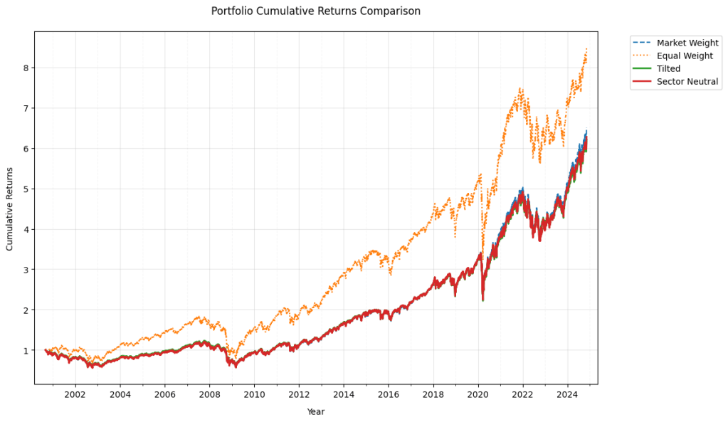 Next, we construct the portfolios of market cap, equal, passive factor tilted and sector neutralized passive factor tilted weightings, then compare their performance: