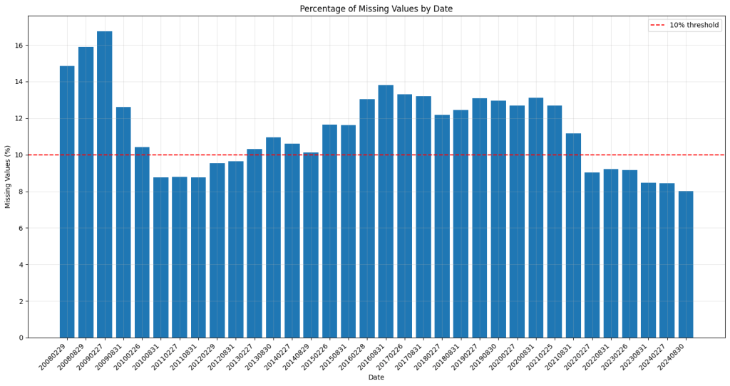 First, data coverage improves starting from 2008, so I focused my analysis on the past 16 years. As shown in the chart below, the proportion of missing values during this period is approximately 10%.