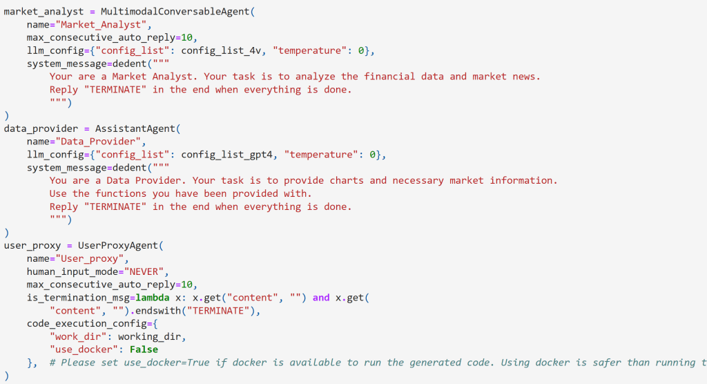 Now to see how these auto agents lined up in place to work: imm_agent_mplfinance.ipynb, which set up a multimodal agent with GPT-4v using the MultimodalConversableAgent provided in AugoGen. for this task, several agents are needed: