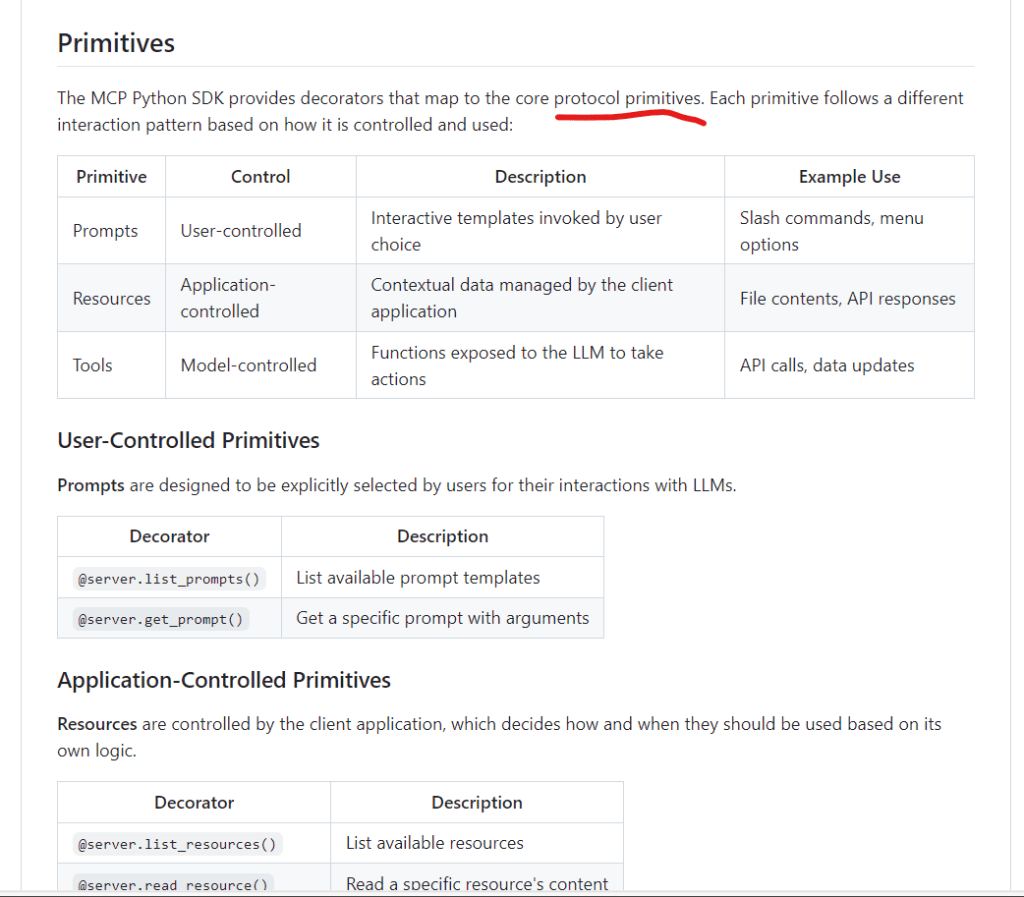3. primitives, python primitives are basic data types, there are number, text, boolean and None primitives, they are immutable, fixed memory size, in contrast to complex data types such as list dictionary, class and objects. in MCP, there are protocol primitives