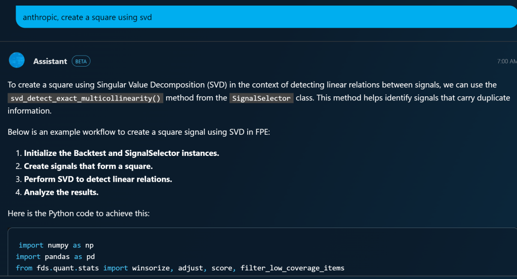 This tool embedded in FPE now solve the generic firm-wide problem of writing proprietary formulas for you. Even in the disclaimer, it emphasize /learn doesn’t actually learn your personal directory, but the company did apply AI to train or finetune its large codebase to solve a big pain point in the firm, which given the most remarkable achievement AI made in programing area, is a fair easy task!