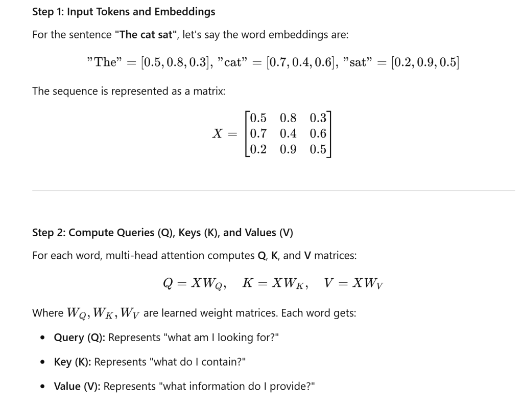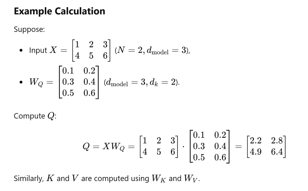 - Using optimization algorithms (e.g., Adam), WQ,WK,W_Q, W_K,WQ,WK, and WVW_VWV are updated to minimize the loss.