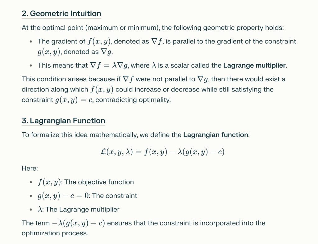 The genius of Lagrange who come up with Lagrange Multiplier to solve optimization problems: Lagrange’s method is rooted in geometric intuition. It recognizes that at the optimal point, the gradient of the objective function must be parallel to the gradient of the constraint function. This insight is captured by the equation