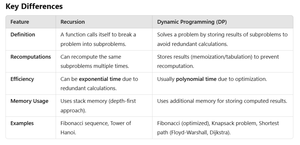 Dynamic programming is an optimization technique that can be applied to recursive problems by storing intermediate results. Recursion is a concept, a way of solving problems where a function calls itself.