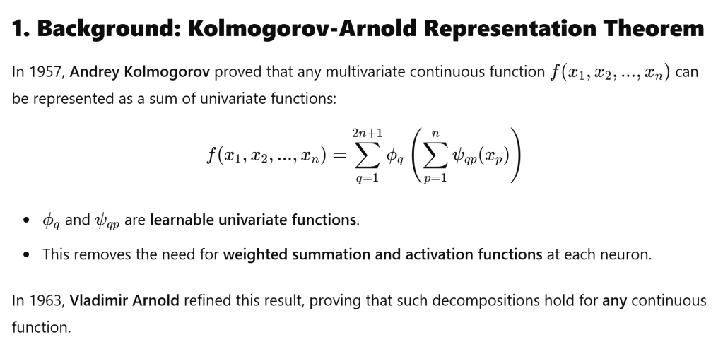 It stems from Kolmogorov-Arnold Representation Theorem, which is quite like Fourier Series as both proved that any multivariate continuous function f(x1,x2,…,xn)f(x_1, x_2, …, x_n)f(x1,x2,…,xn) can be represented as a sum of univariate functions.
