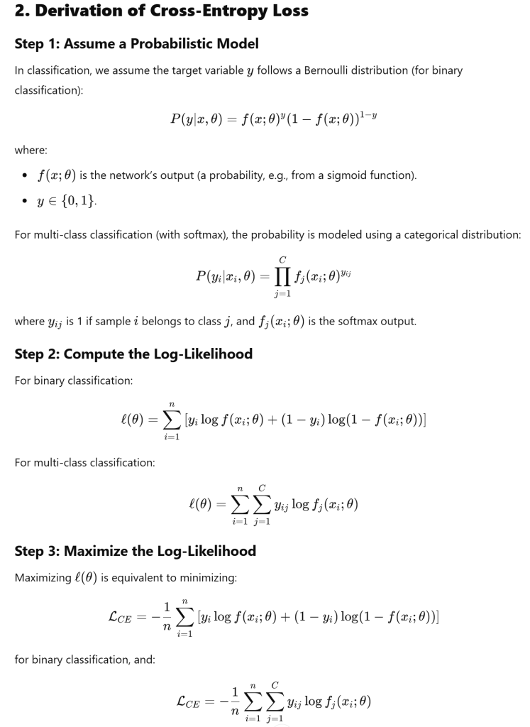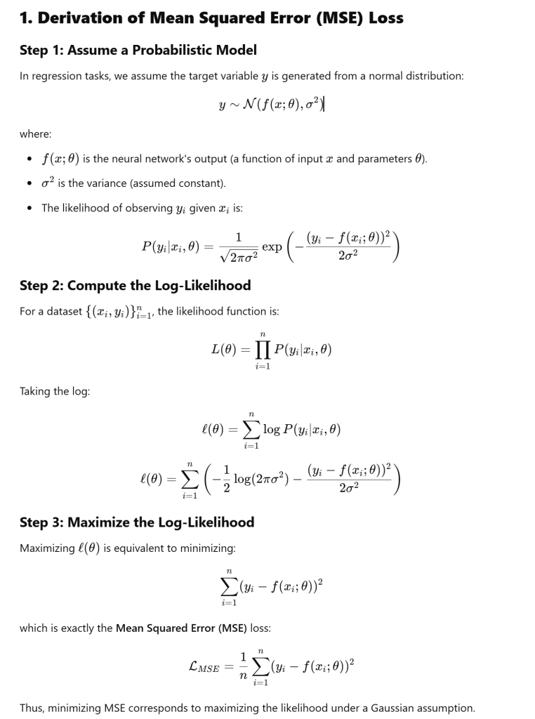 Loss functions in neural networks can often be derived using MLE by assuming a probabilistic model for the output. Below, we derive Mean Squared Error (MSE) and Cross-Entropy Loss from MLE principles.