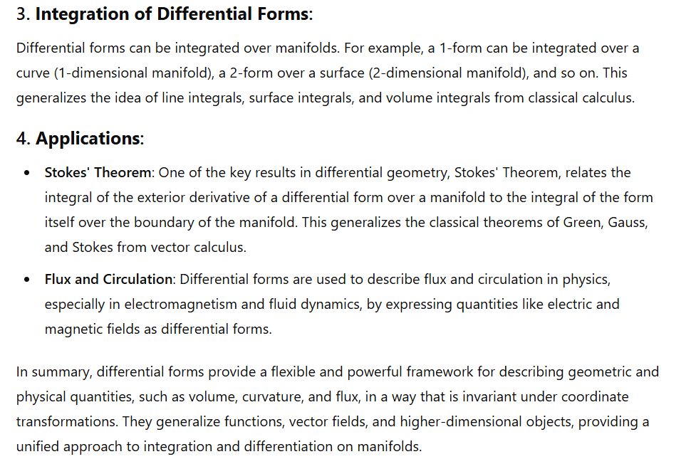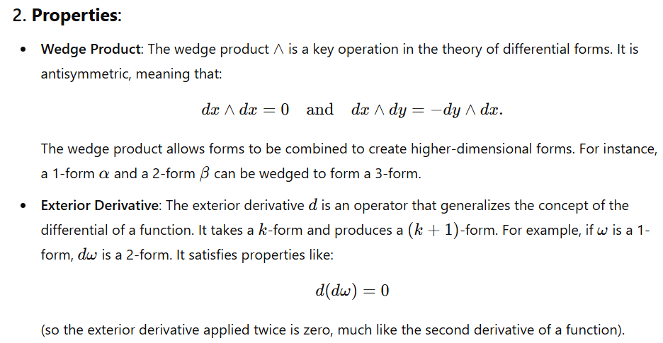 Differential forms: are mathematical objects used in differential geometry, calculus, and topology. They generalize functions, vectors, and other geometric objects and play a crucial role in the study of manifolds, integrals, and differential equations.
