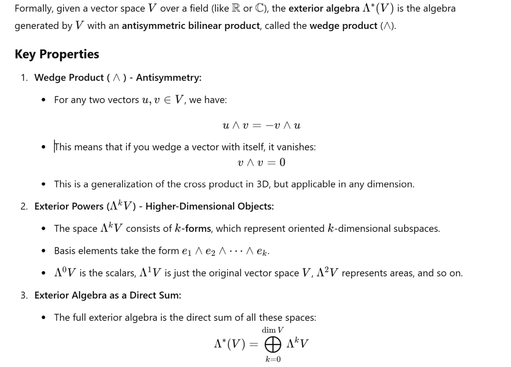 Exterior algebra is a mathematical structure that extends linear algebra to handle oriented areas, volumes, and higher-dimensional objects using a formal system of “wedge products.” It is fundamental in differential geometry, gauge theory, and physics.
