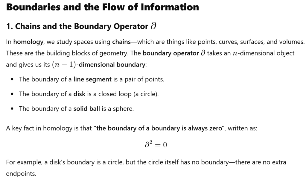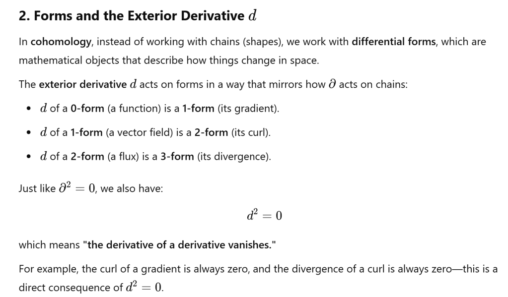 At its core, differentiation isn’t just about slopes—it’s about how things flow across a space. And just as boundaries “trap” something inside, derivatives measure how things “escape” or spread out. Let’s explore this intuition using chains (homology) and forms (cohomology).