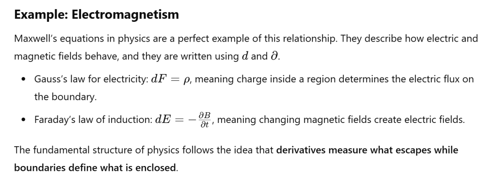 In calculus, we learn that the derivative measures change. But in a deeper mathematical sense, differentiation acts as the opposite of taking a boundary. This idea is best understood using the language of differential forms and chains.