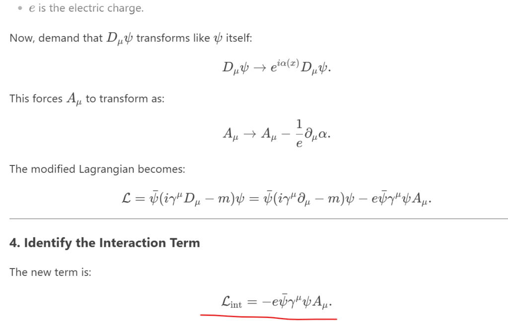 The interaction term in Quantum Electrodynamics (QED) describes how electrons (and other charged particles) couple to photons, leading to electromagnetic forces. Here’s a step-by-step derivation: