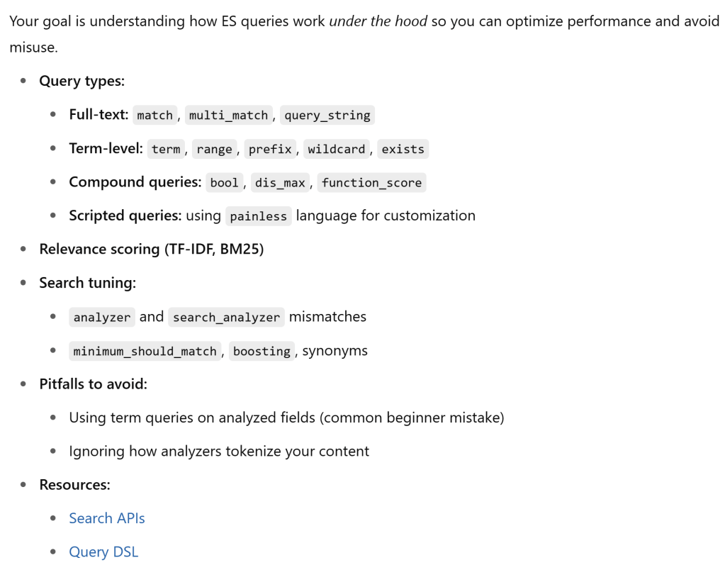 - Pagination, Limits and Performance: from/size pagination is suitable for small offsets, but inefficient for deep pagination, i.e. from > 10,000 is costly. the alternative is “search after” which relies on a sort value from the last docuemnt, it’s efficietn but requires stable sorting, e.g. sort by timestamp + ID