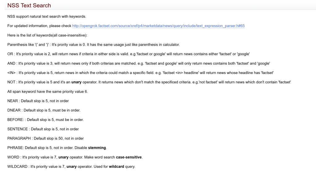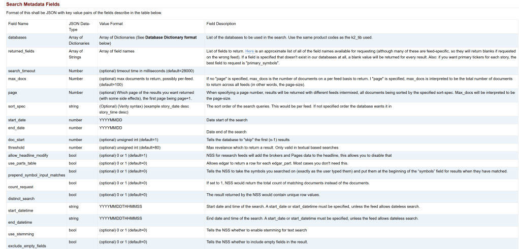 Search meta information sample: {“databases”:[ {“databases”:[“BW”], “start_date”:”20090901″, “end_date”:”20090905″}, {“databases”:[“FRC”]} ], “returned_fields”:[“headline”,”story_date”,”story_time”,”product”], “search_timeout”:28000, “max_docs”:200, “sort_spec”:”story_date ASC”, “start_date”:”20090805″, “end_date”:”20090905″ }