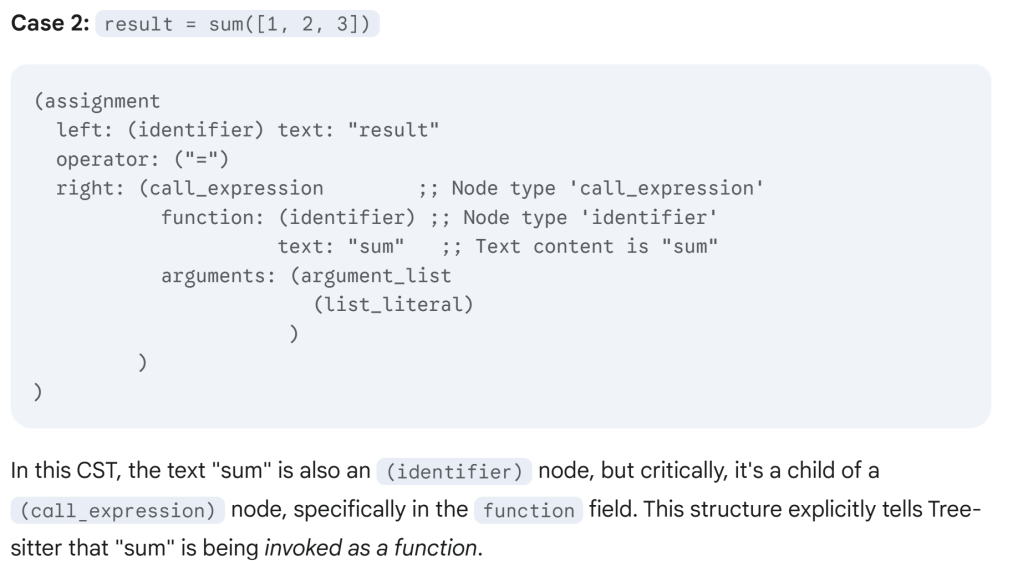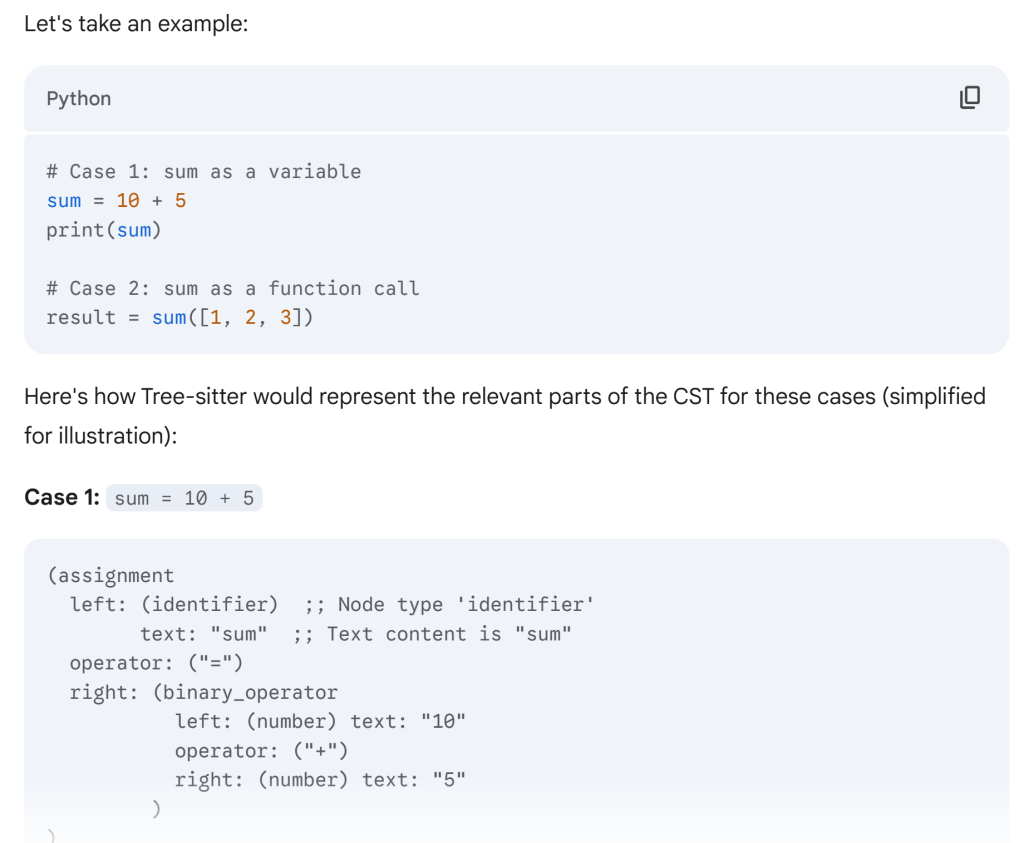 When Tree-sitter parses the code, it doesn’t just see “sum”. It sees “sum” in a context within the code’s structure.