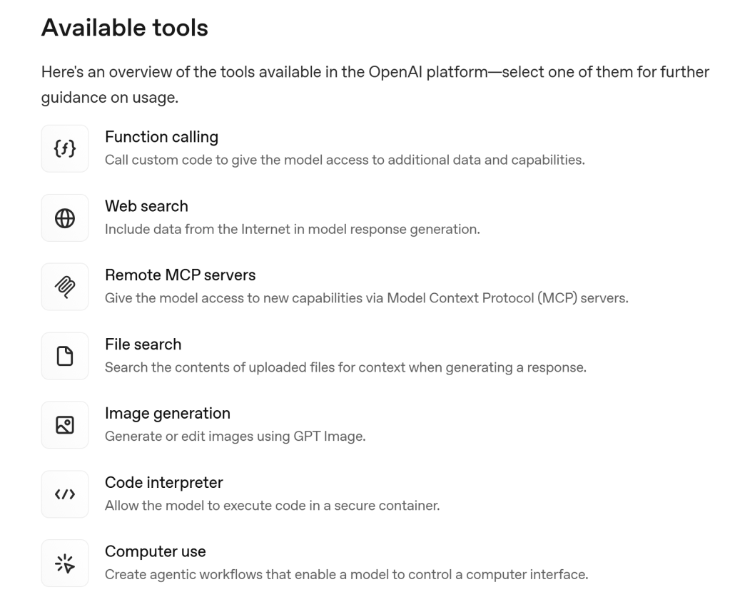 Here is a complete, structured list of the capabilities / “tools” OpenAI currently provides for agents (through ChatGPT and the API), summarized by OpenAI itself: