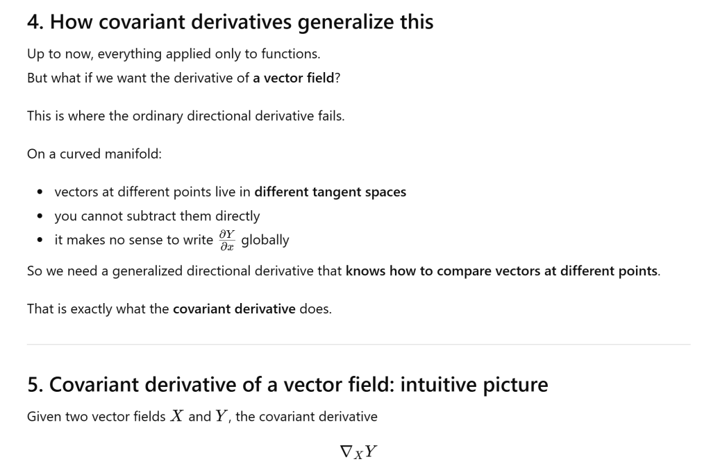 Bridging Directional Derivative to Covariant Derivative December 3, 2025 / Naixian Zhang Share this: Click to share on X (Opens in new window) X Click to share on Facebook (Opens in new window) Facebook Like Loading... Related