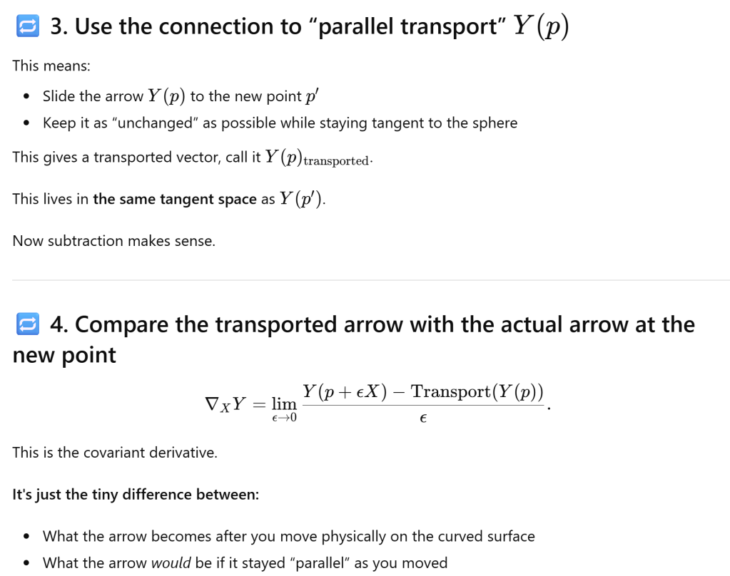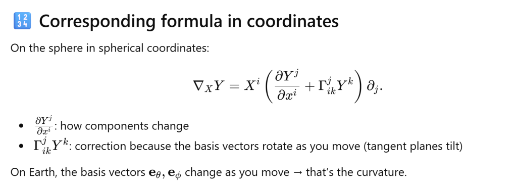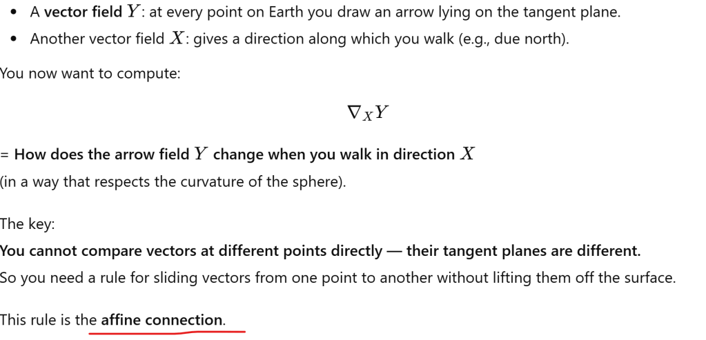 Grasp Concept of Covariant Derivative Using the arrow-moving-on-a-sphere example December 3, 2025 / Naixian Zhang Imagine the sphere as Earth, and vector filed are arrows painted on the surface. Share this: Click to share on X (Opens in new window) X Click to share on Facebook (Opens in new window) Facebook Like Loading... Related