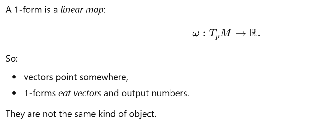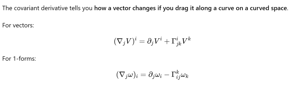 Then we discuss directional derivative, covariant derivative and exterior derivative! Exterior derivative is totally different than directional or covariant derivative, it acts on differential forms who lives in covector space!