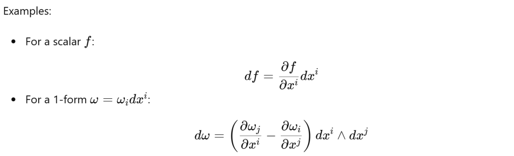 Exterior derivative takes a “measurement” and tells you how it changes as you walk around a tiny loop. it increases degree by 1: