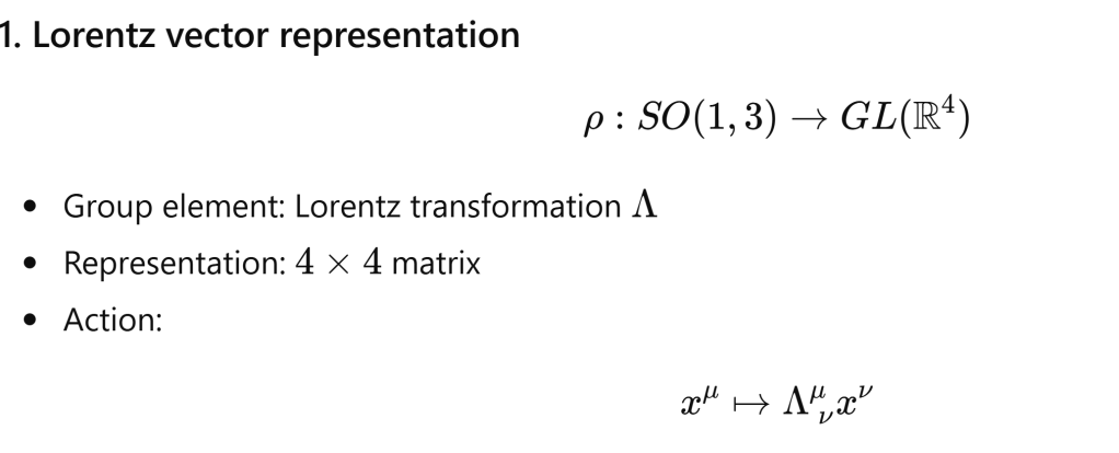 Let’s talk about Lorentz representation, Spinor representation and Lie Algebra version to grasp this concept.