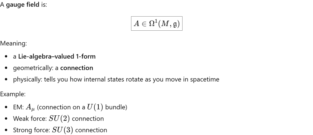 What is gauge field? It is a Lie Algebra Valued 1-form on space time.
