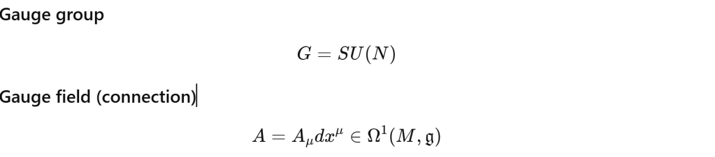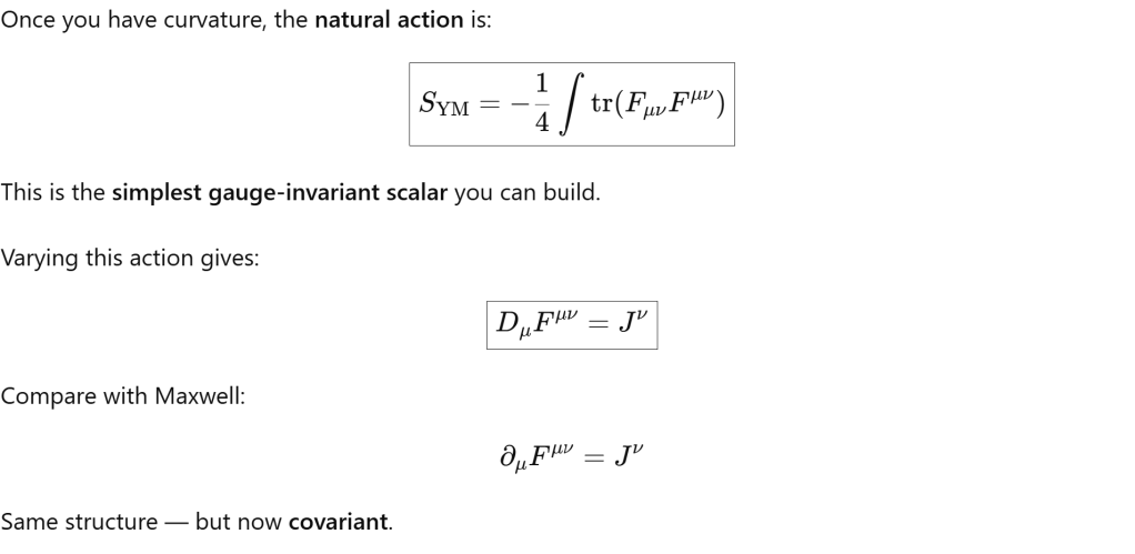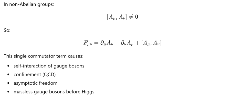 However, What if the internal symmetry is non-Abelian (like SU(2))? The gauge field has multiple components: The curvature picks up A∧A; Gauge bosons interact with each other. This is Yang–Mills theory.