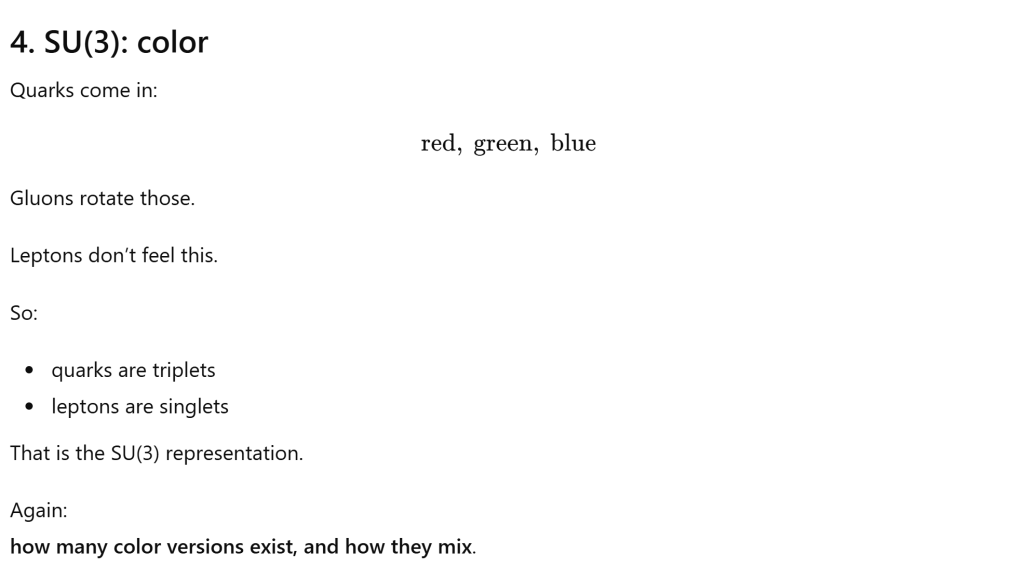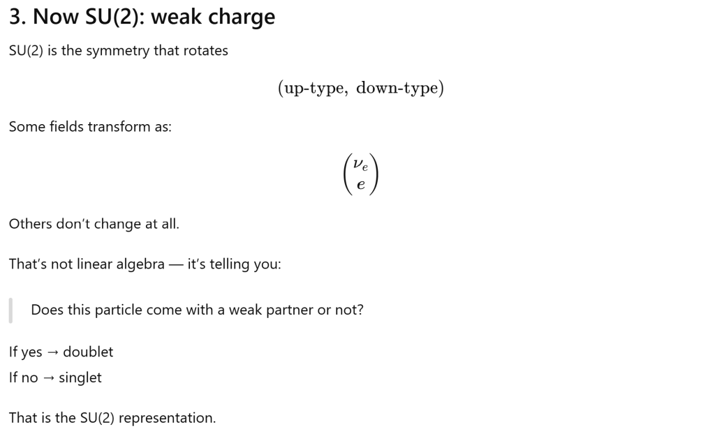 But A field is not “a particle”. A field is a section of a bundle. Different particles correspond to different ways of transforming under the symmetry group. Mathematically: particles = representations of SU(3) x SU(2) x U(1).
