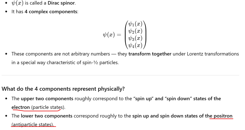 Now I’d like to connect these understanding to spinors in Dirac Equation. When we talk about spinors in the Dirac equation, we mean the 4-component wavefunction itself.