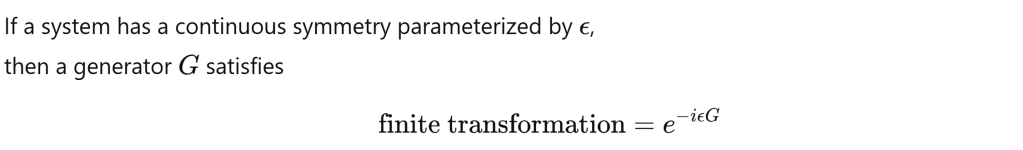 What is a generator? A generator is the object that tells you how something changes under an infinitesimal symmetry transformation. We need to entirely understand this via the lens of Lie Group and Lie Algebra. generator lives in the tangent vector space and is making the rotation on infinitesimal scale.