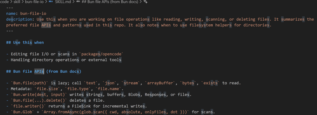 Skills are essentially reusable prompt templates that encode project-specific knowledge. Instead of explaining “use Bun APIs, not Node fs” every time, you write it once in a skill. The LLM automatically loads it when relevant.