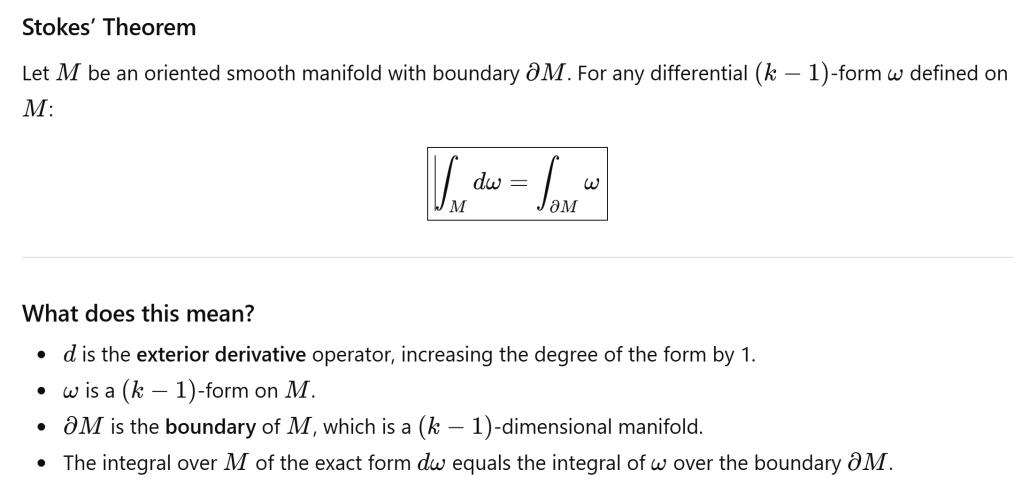 Here’s Stokes’ theorem in its most general and elegant form from differential geometry, using the beautiful, rigorous differential geometry terminology: