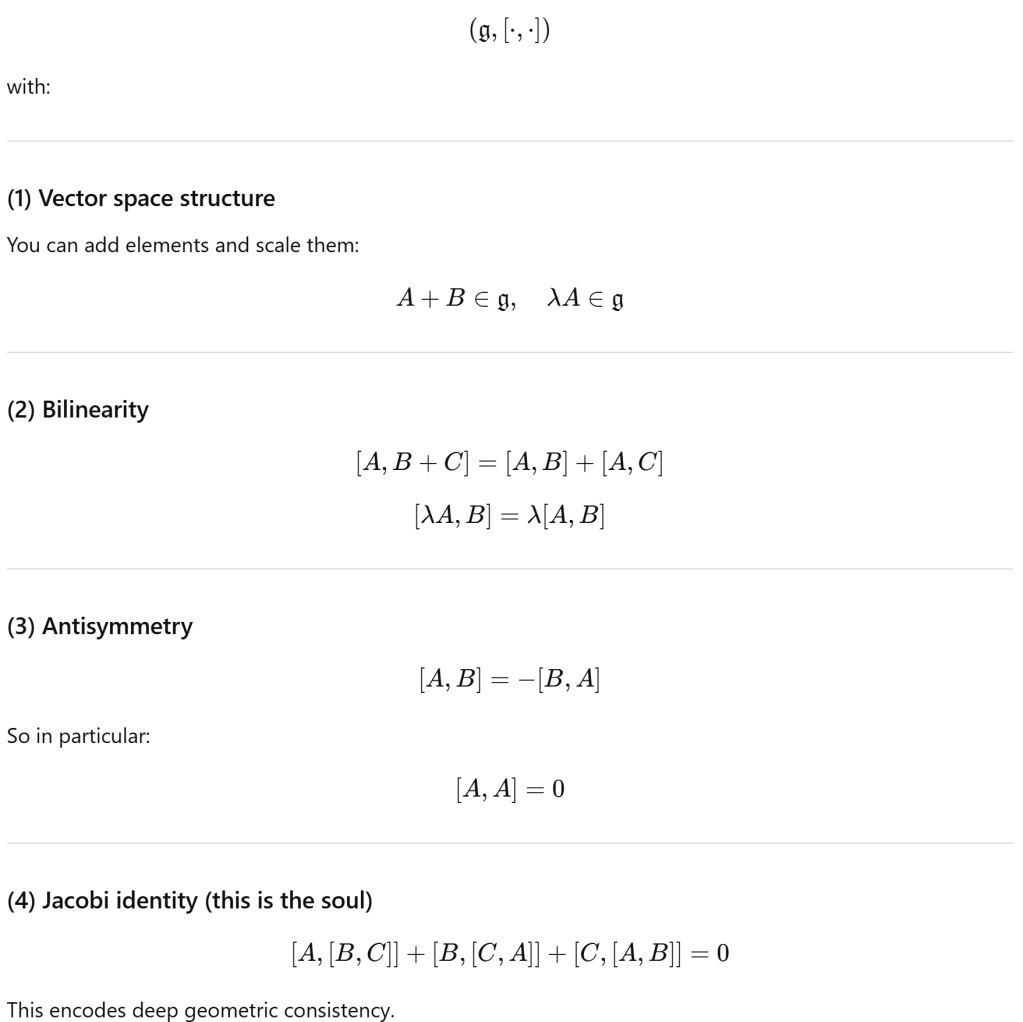 Mathematically, A Lie algebra is:
